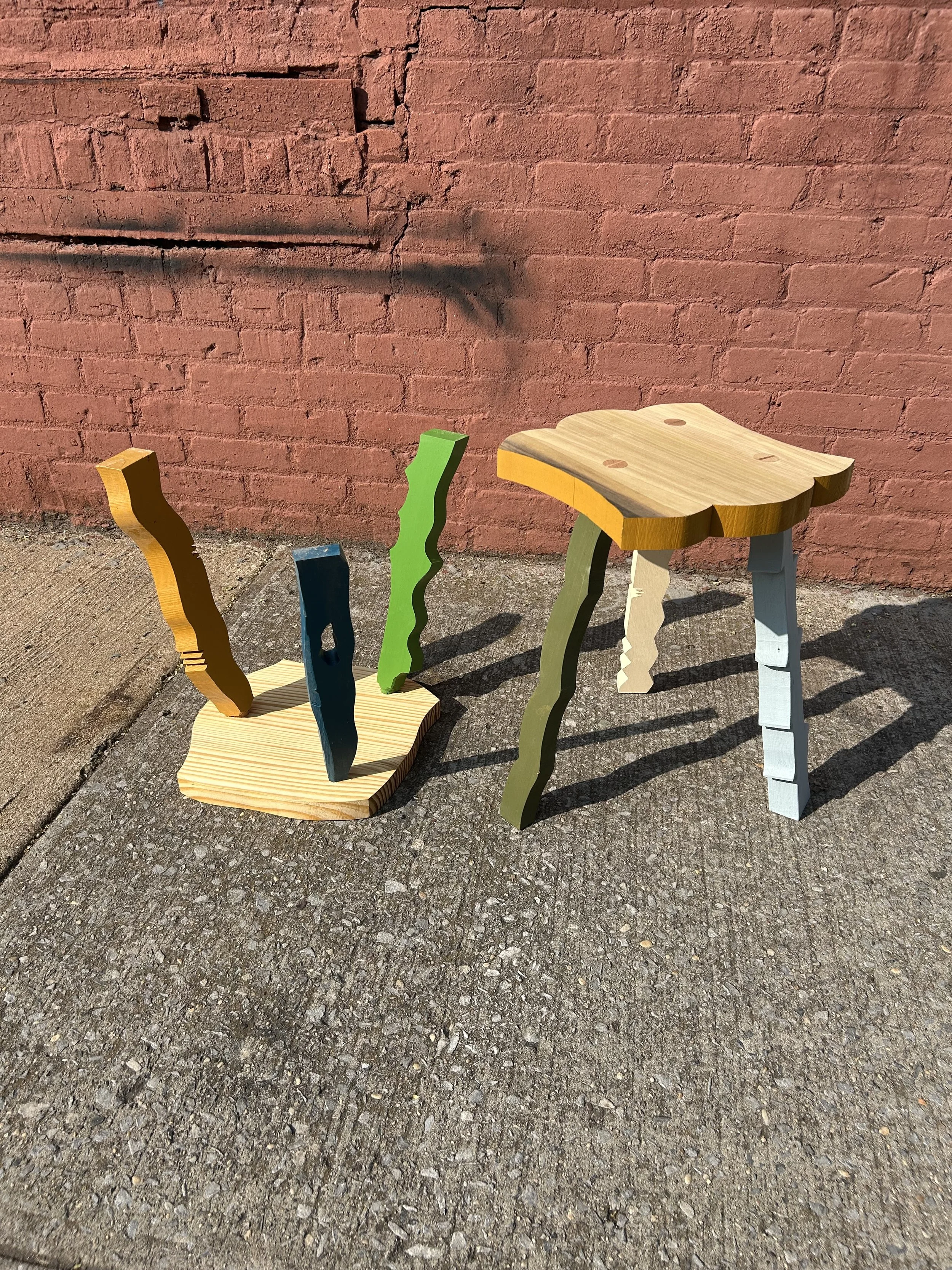 An ongoing exploration of improvisation in the form of sculptural three legged stools, side tables, and plant stands. Made with second-hand or recycled materials. 2025 and onward.